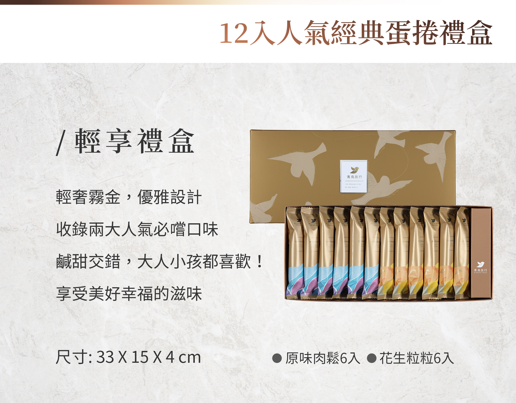 青鳥旅行輕享禮盒12入,精選原味肉鬆與花生粒粒兩款經典蛋捲。